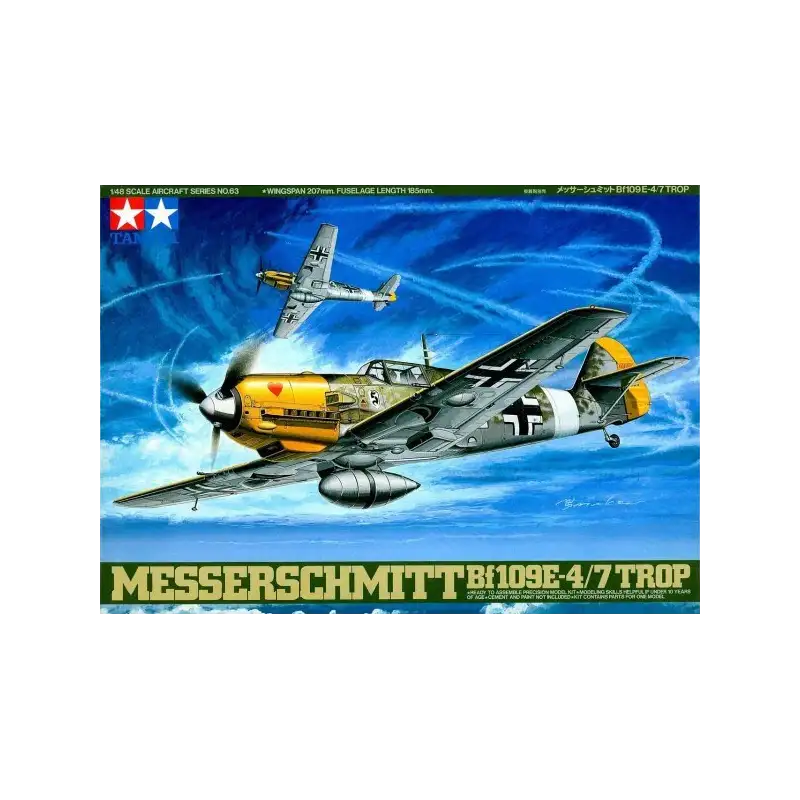 This is a Tamiya 1/48 Messerschmitt Bf109E-4/7 Tropical Model Kit. The Messerschmitt Bf 109E was the Luftwaffe's mainstay fighter in the early stages of WWII. This kit depicts the E-4, which was produced from May 1940 and saw extensive action during the Battle of Britain, and the E-7, which was fitted with a drop tank for increased range. The angular form of the aircraft has been accurately reproduced complete with details such as a canopy that may be assembled in open or closed position, a rack for the E-7's drop tank, and the Trop version's air intake with sand filter. One pilot figure and three marking options are included.