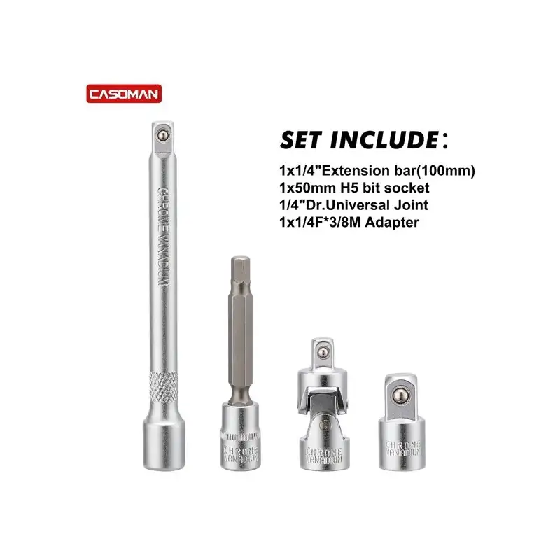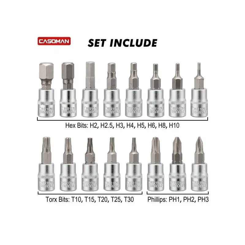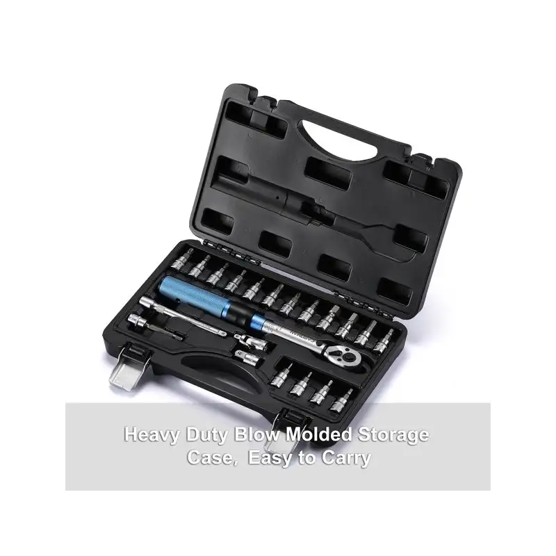 • Set include: 1x1/4"Dr Torque Wrench; 1x1/4"Extension bar(100mm); 1x1/4"F* 3/8"M Adapter; 1/4"Dr.Universal Joint;1 piece 50mm H5 bit socket; Hex Bits: H2, H2.5, H3, H4, H5, H6, H8, H10. Torx Bits:T10,T15,T20,T25,T30. Phillips:PH1,PH2,PH3.