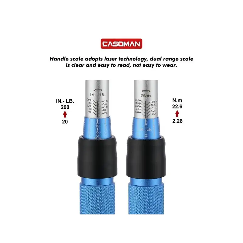 The CASOMAN 11/4-inch Drive Click Torque Wrench Set, which is manufactured from Chrome-molybdenum steel ensures maximum strength and durability. The handle is made of Aluminum alloy, which is comfortable to grip, anti-skid, anti-rust and anti-corrosion. High accuracy design, Install components with calibrated precision from 2.0 to 22.0 Newton Meter torque range (20 to 200 inch per pound).