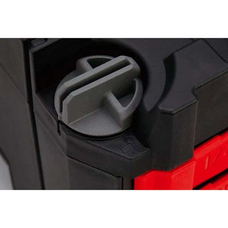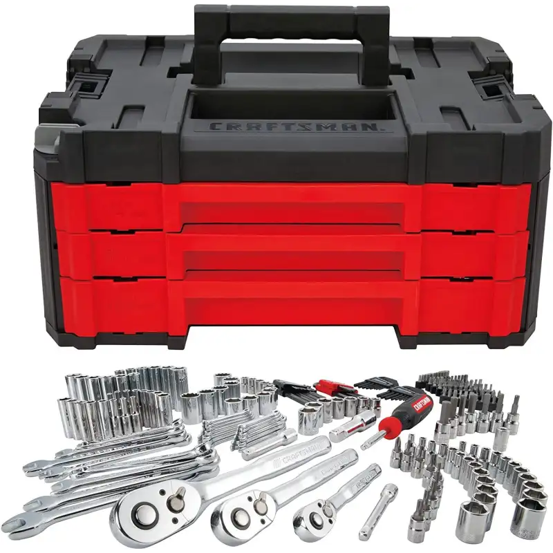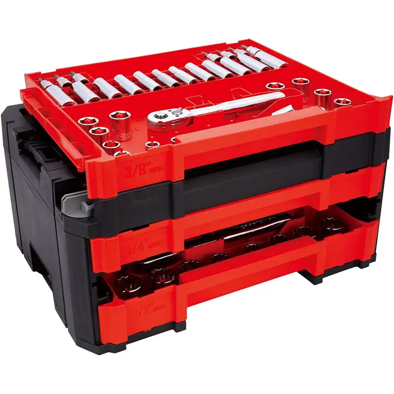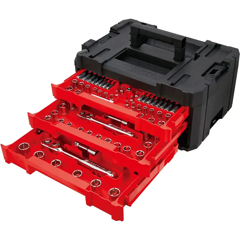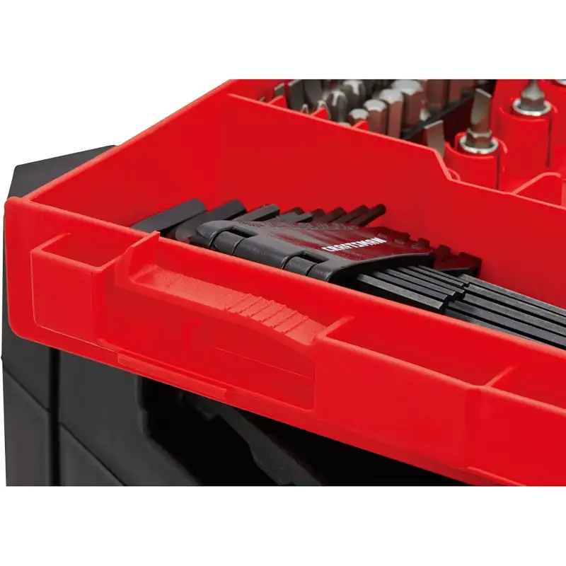 Keep your tools organized in your garage or workshop whether you're a semi-professional repair worker or an expert with the help of this VERSASTACK™ 230-piece 3-Drawer Mechanic Tool Set. Conveniently stackable, this space-saving tool set is a flexible platform that allows for many different combinations of storage options based on your needs. The set is designed for security and ease of use with its drawer lock dial which quickly locks the drawers in place when not in use to prevent contents from falling out. Seamlessly remove the drawers using the integrated drawer stop system and open with one hand to get right to your ratchets, sockets, wrenches, hex keys, specialty bits, and accessories. For fast access, sit the mechanic tool set drawer on top of the tool box for temporary storage as you work.