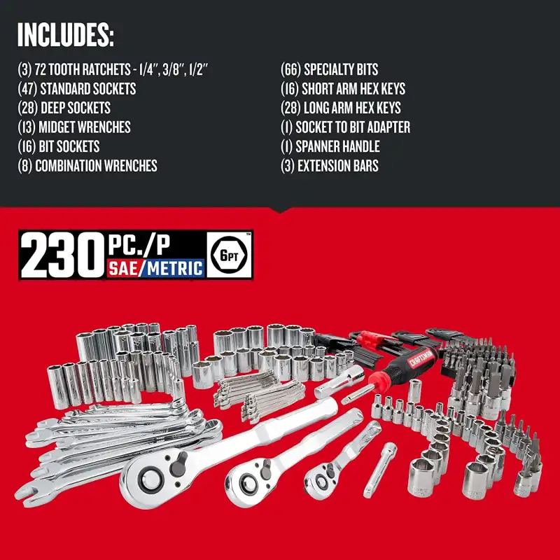 • LONG-LASTING STEEL CONSTRUCTION: Sockets, wrenches, and ratchets are finished with full-polish chrome for strength and corrosion protection so your tools last longer