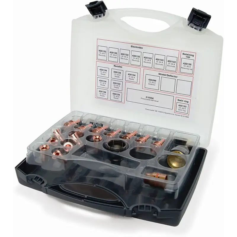 Kit provides all of the consumables needed to operate a Powermax30 AIR plasma system. Convenient storage case for organizing and maintaining your consumables. Kit contains electrodes and nozzles along with the swirl ring, shield and retaining cap.